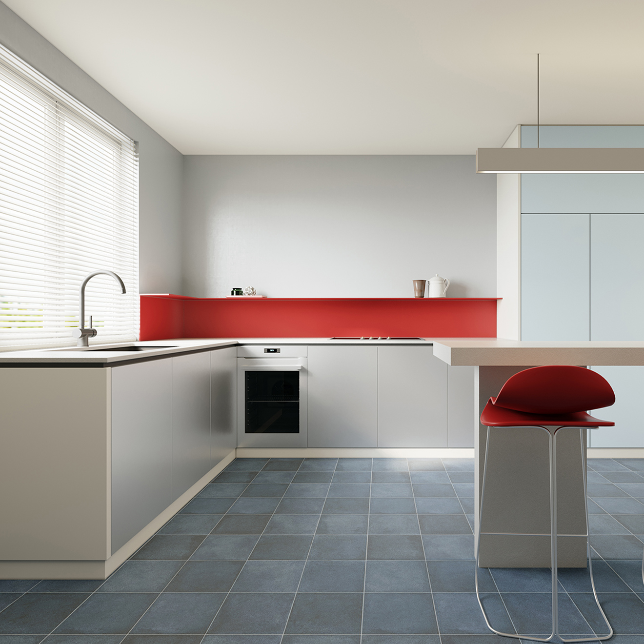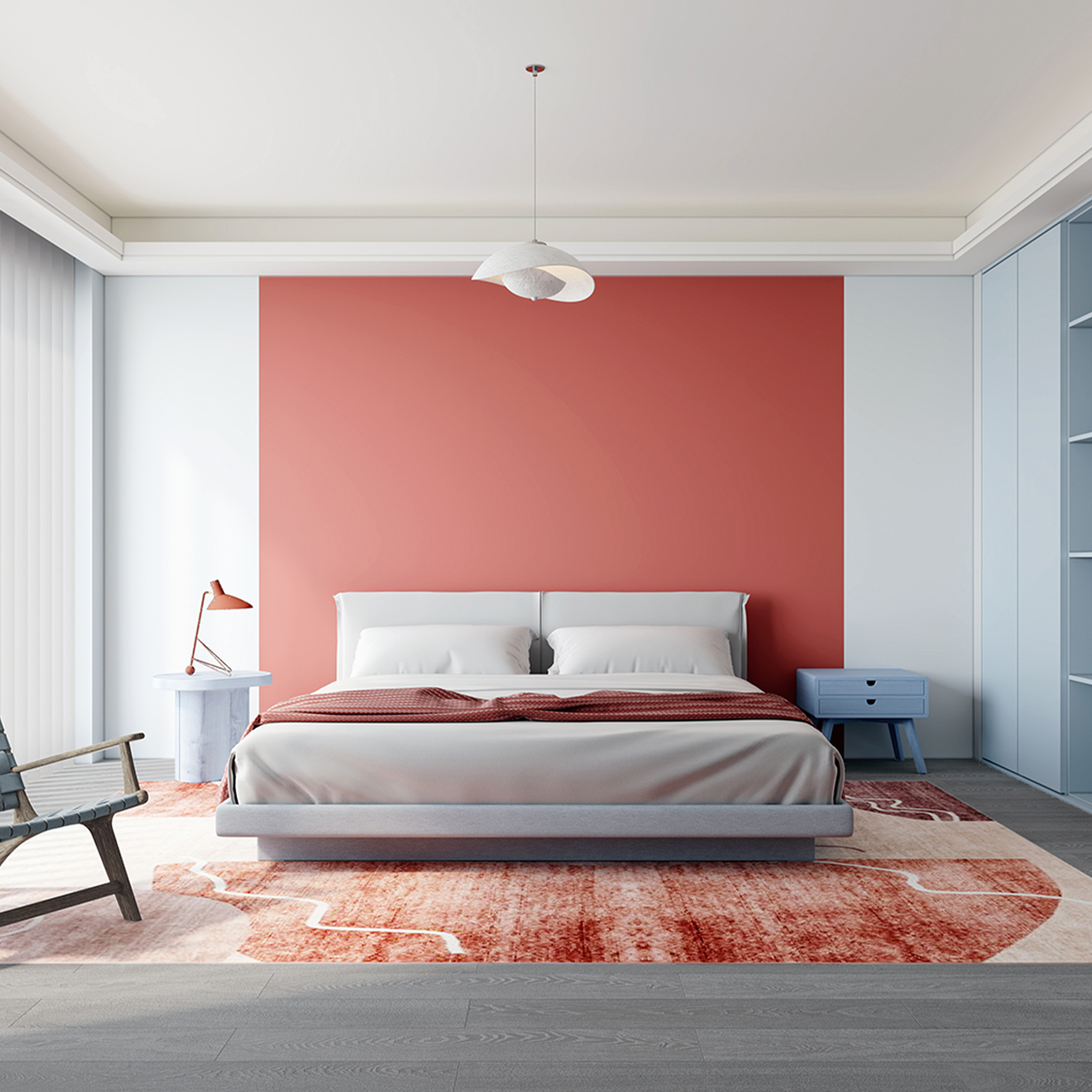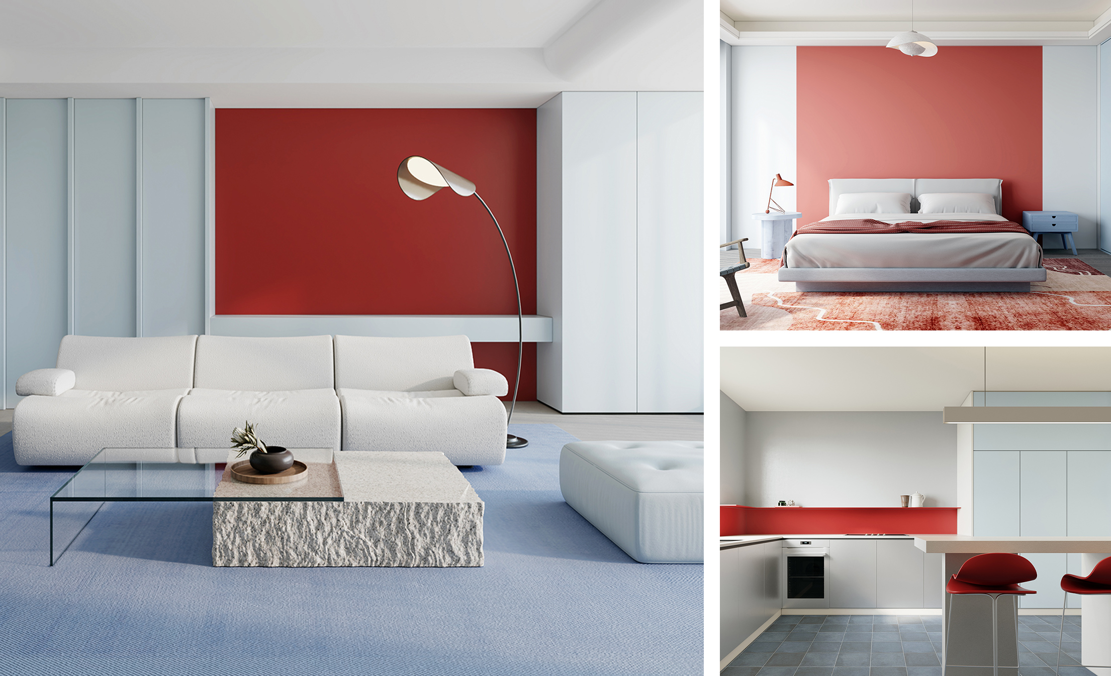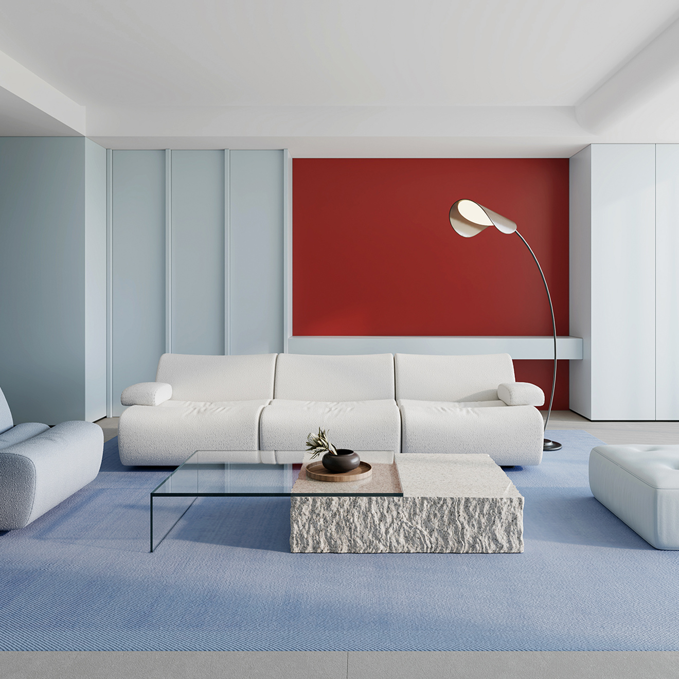 告別濃墨重彩的修飾,在不緊不慢的步伐間,以松弛的呼吸感忠于本真。空間在淺灰、砂白間輕柔鋪展,藍色如湖水般清亮通透,一抹“元力紅”如穿透晨霧的日光,為自由的靈魂尋找到舒適自在的棲息地。